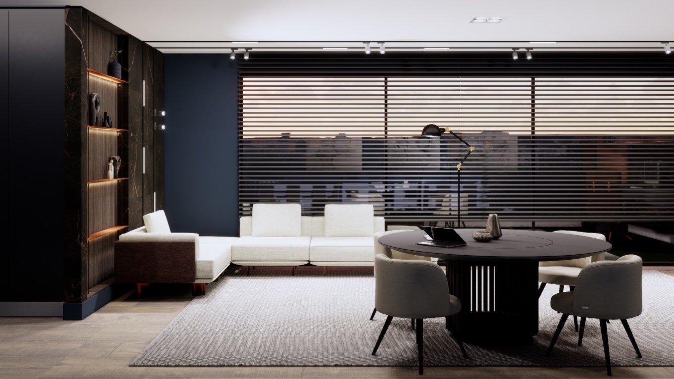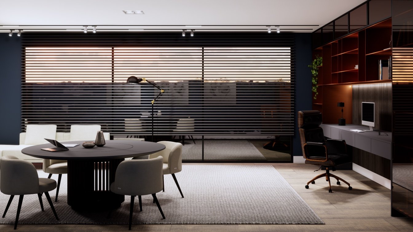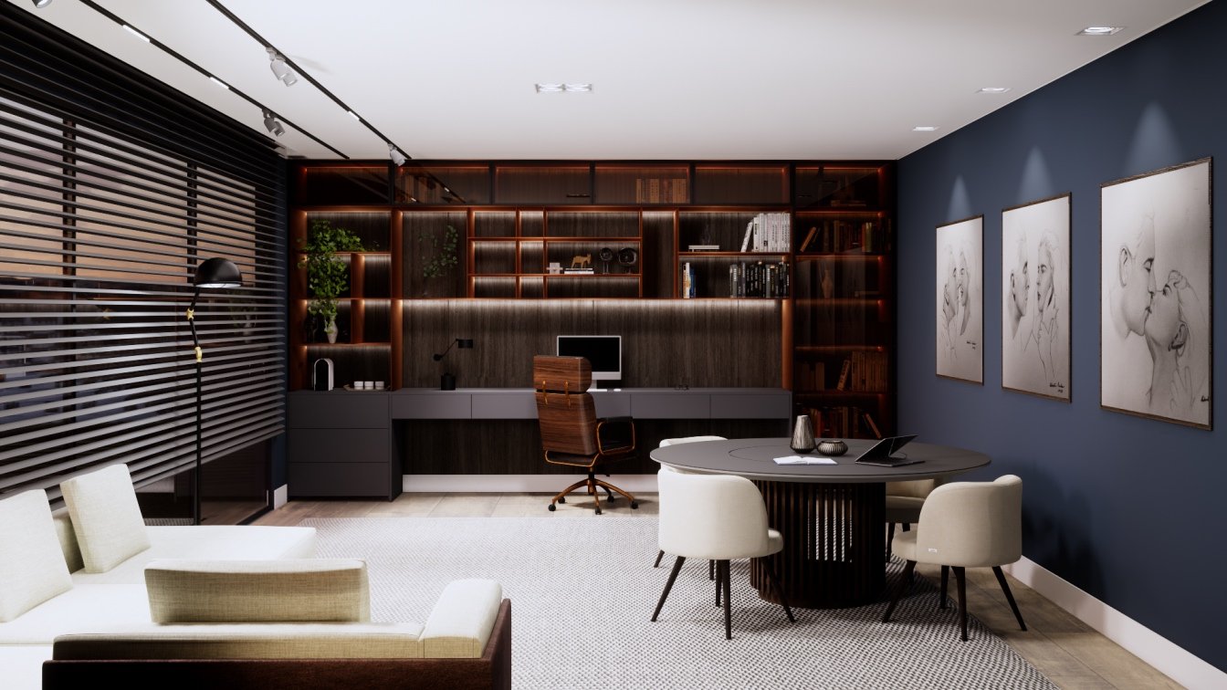Neste projeto, a sofisticação e o conforto se encontram em um ambiente pensado para proporcionar funcionalidade e aconchego. A cor azul foi escolhida como elemento central, aplicando-se nas paredes e em móveis cuidadosamente selecionados, conferindo um ar elegante e acolhedor. No home office, a presença de quadros autorais traz um toque de personalidade ao espaço, enquanto a mesa, projetada em maior proporção, oferece versatilidade para receber visitas e possibilitar momentos de colaboração e produtividade. Um espaço que equilibra estilo e funcionalidade, perfeito para quem busca conforto sem abrir mão da sofisticação.