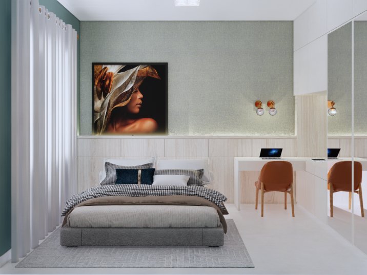 Para a paleta de cores, fugimos do tradicional cinza e branco, optando por tons que evocam a natureza, como verde, madeira e texturas suaves. O resultado é um ambiente atemporal, equilibrado e acolhedor, proporcionando bem-estar e sofisticação sem perder a essência do lar.